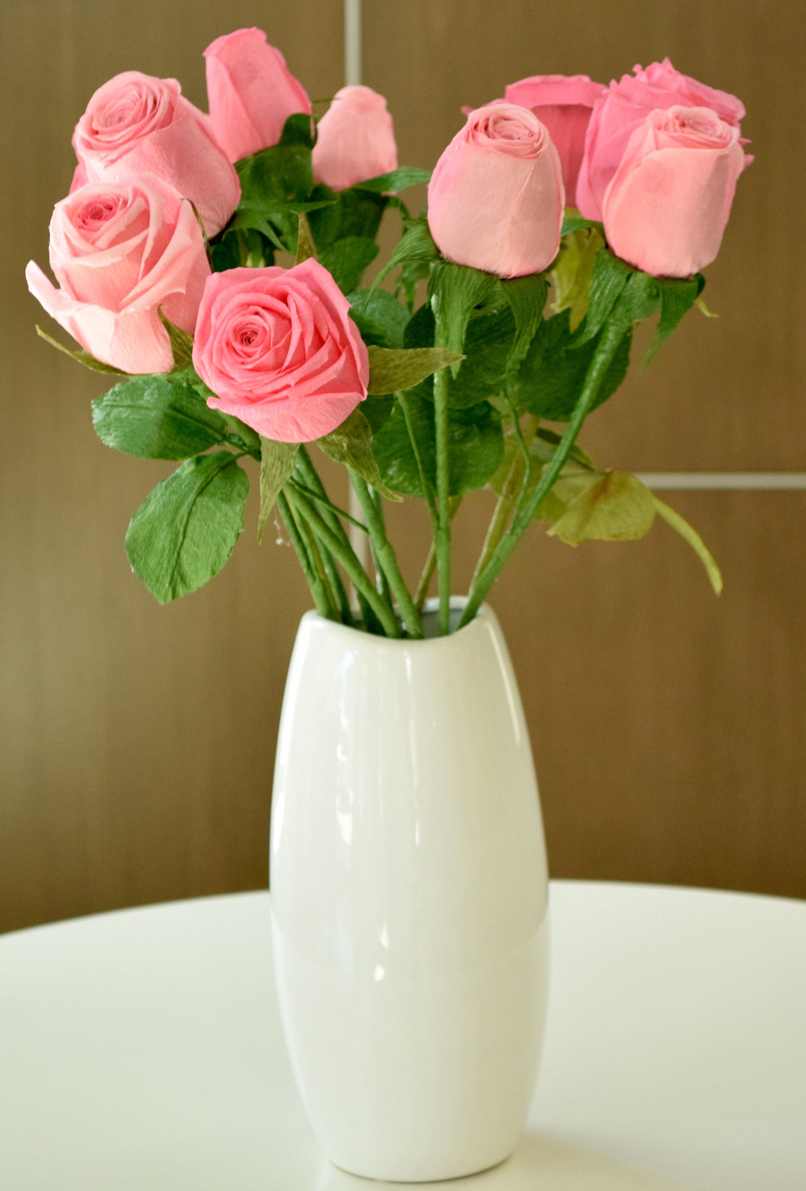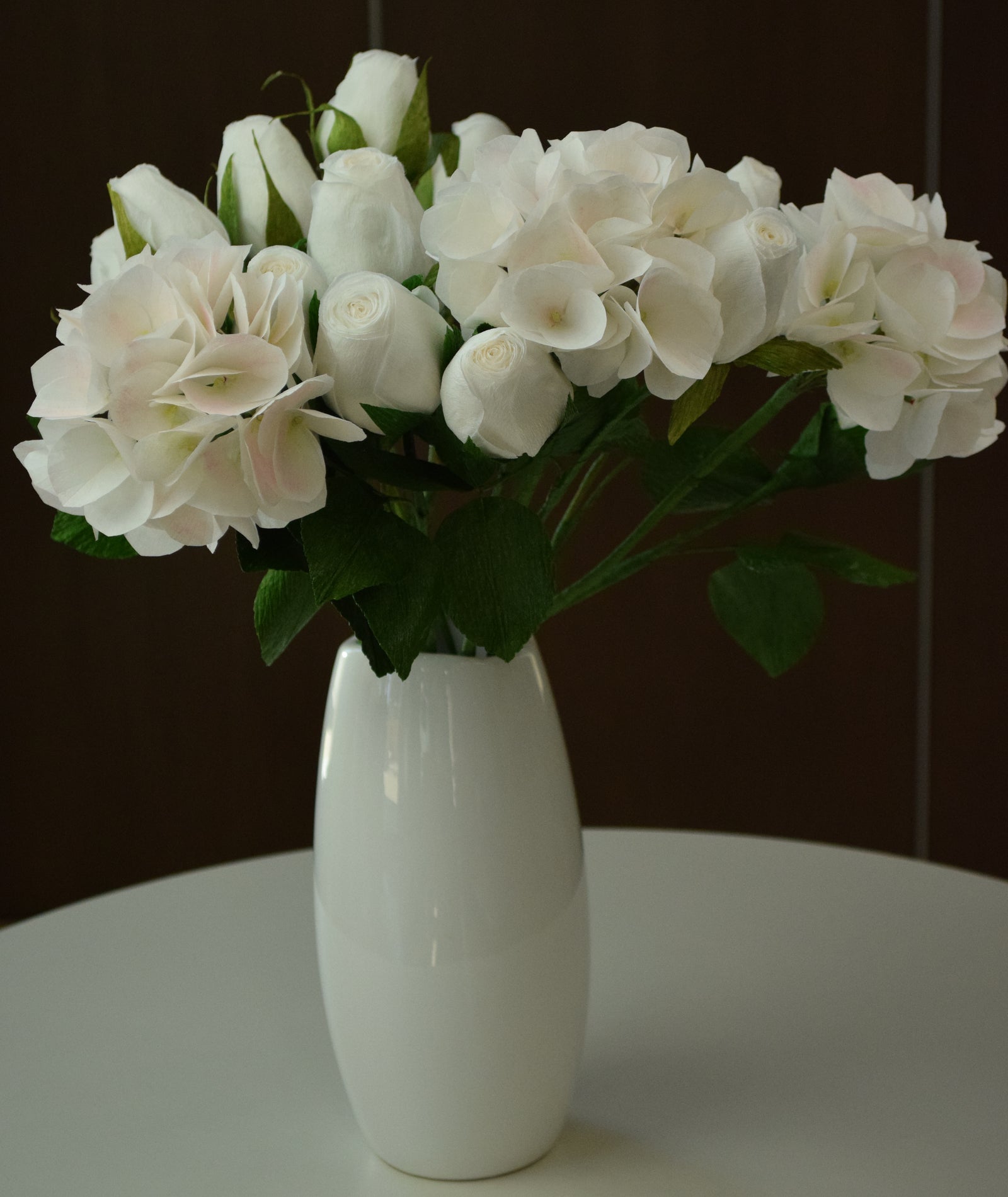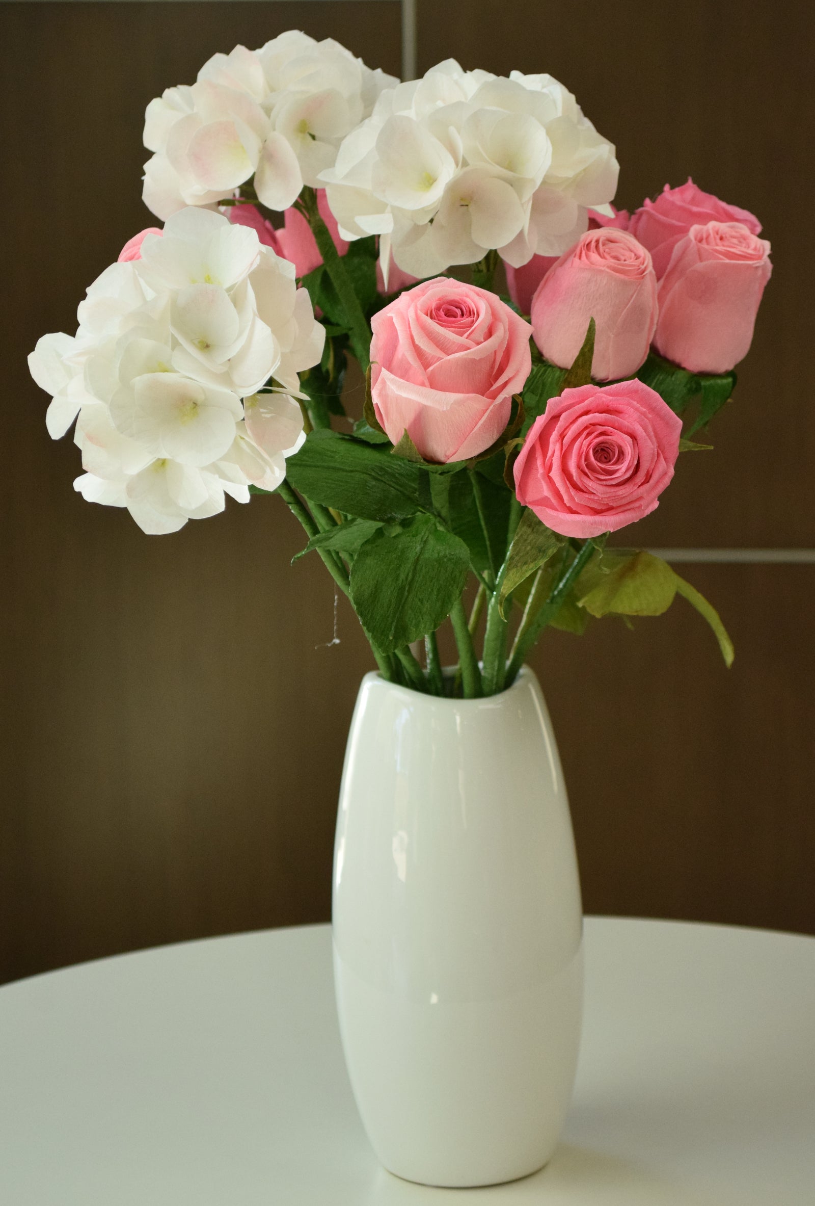 Dozen pink hybrid roses and 3 powder pink hydrangeas
